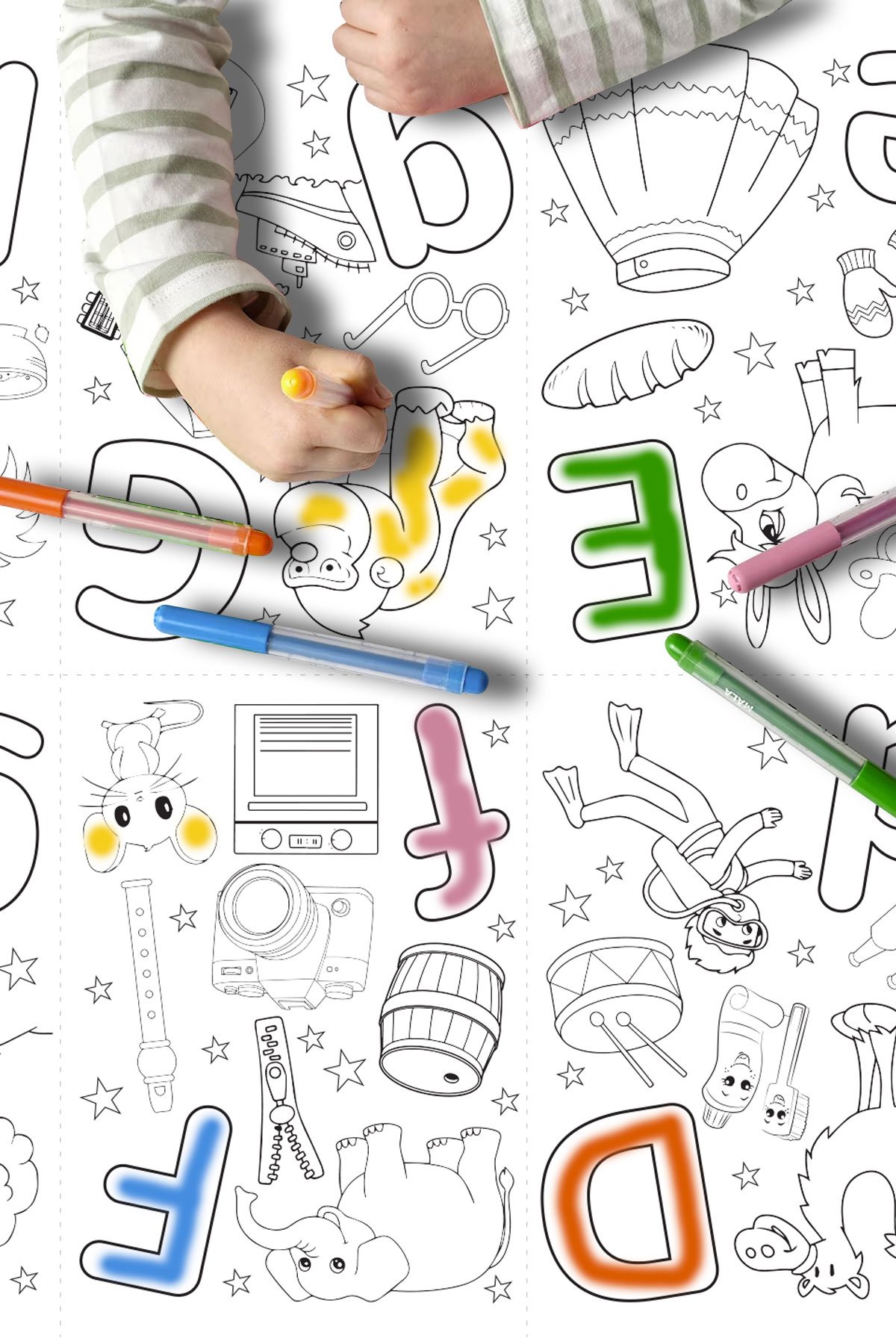 Alfabe, harfler, sayılar ve şekiller dünyasını bir araya getiren bu boyama kağıdı, sanatsever ve öğrenmeyi seven çocuklar için harika bir hediye seçeneğidir. Doğum günleri, özel günler veya herhangi bir günü renklendirmek için idealdir.