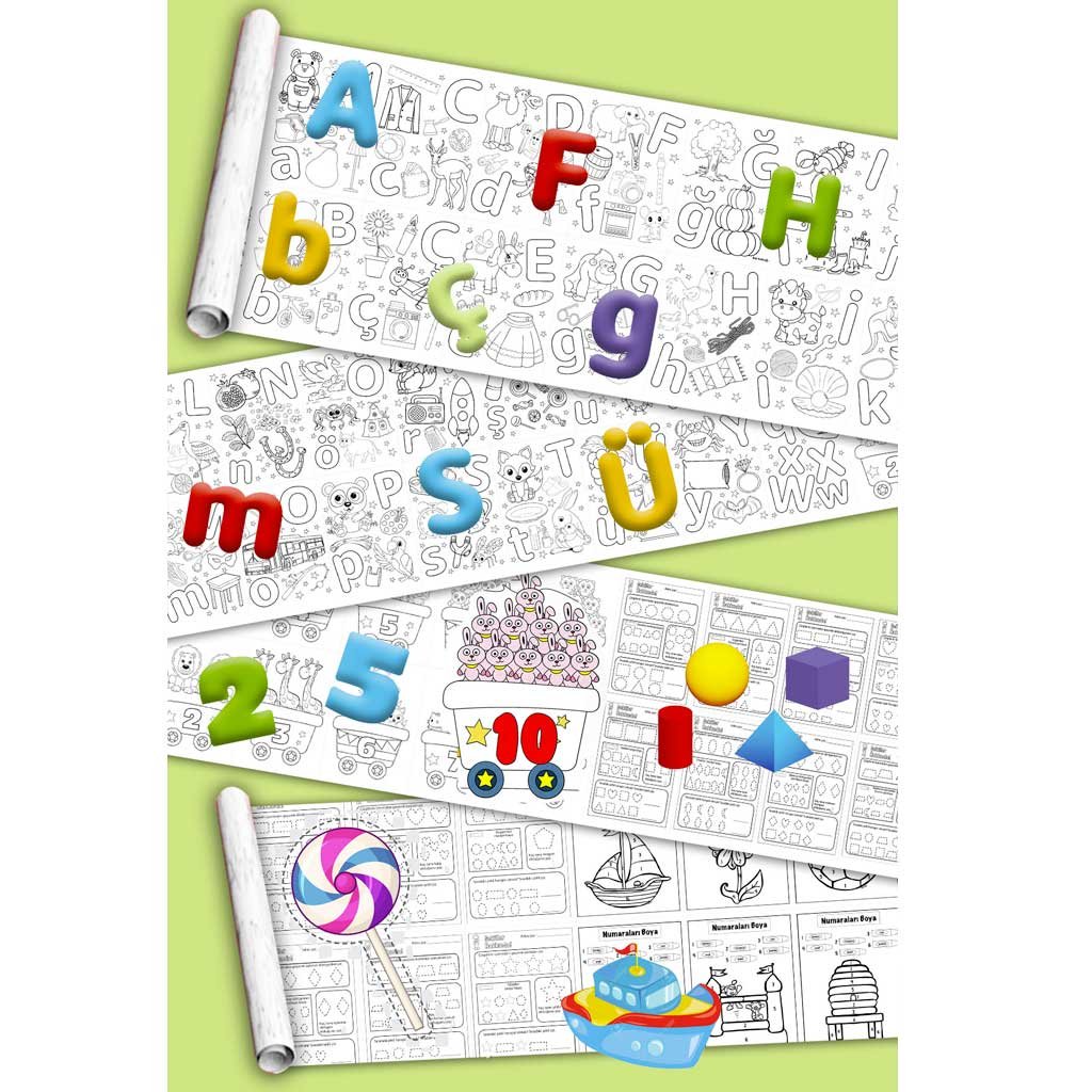 🌈 Keşfet, Öğren, Renklendir: Alfabe – Harfler – Sayılar – Şekiller Boyama Kağıdı Rulosu!
