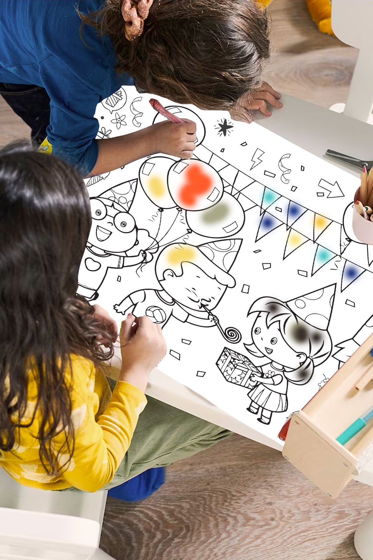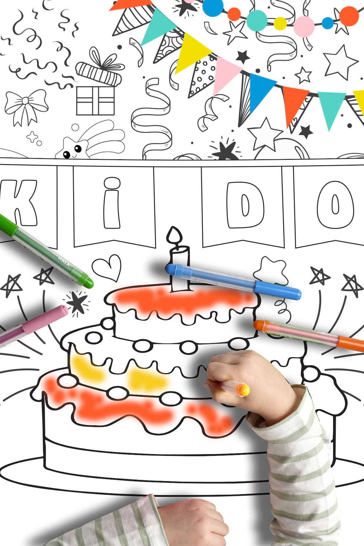 Bu özel konsept, çocukların renk paletini kullanarak kendi doğum günü maceralarını yazmalarına ve kağıdı diledikleri gibi renklendirmelerine olanak tanır.