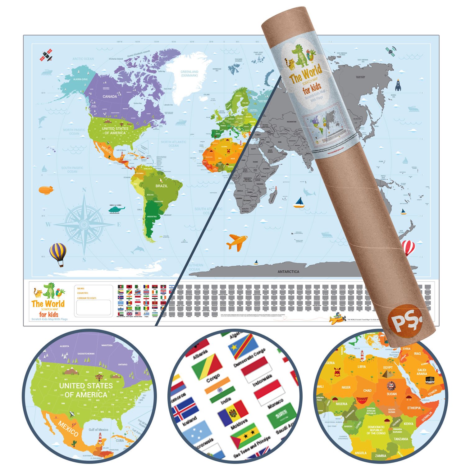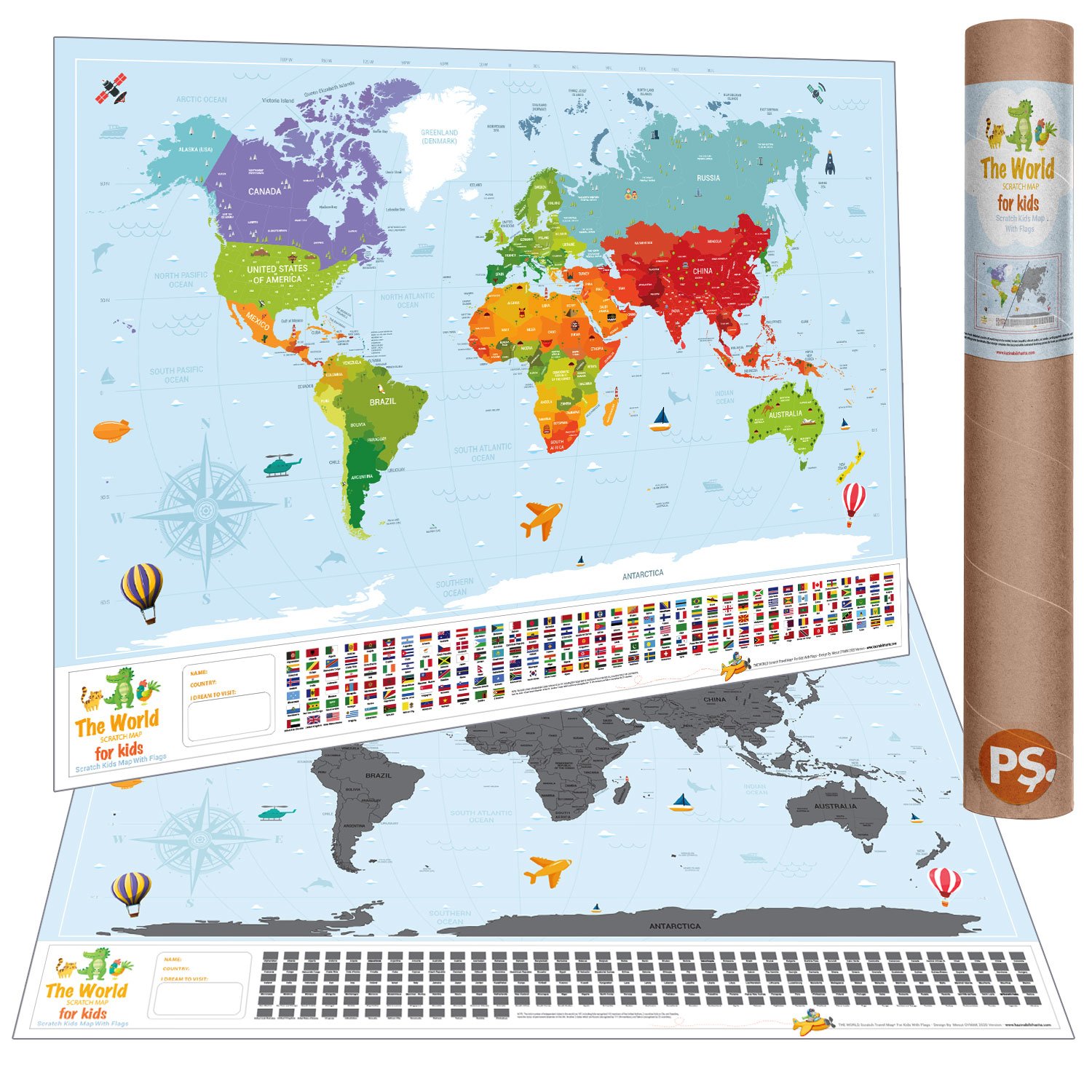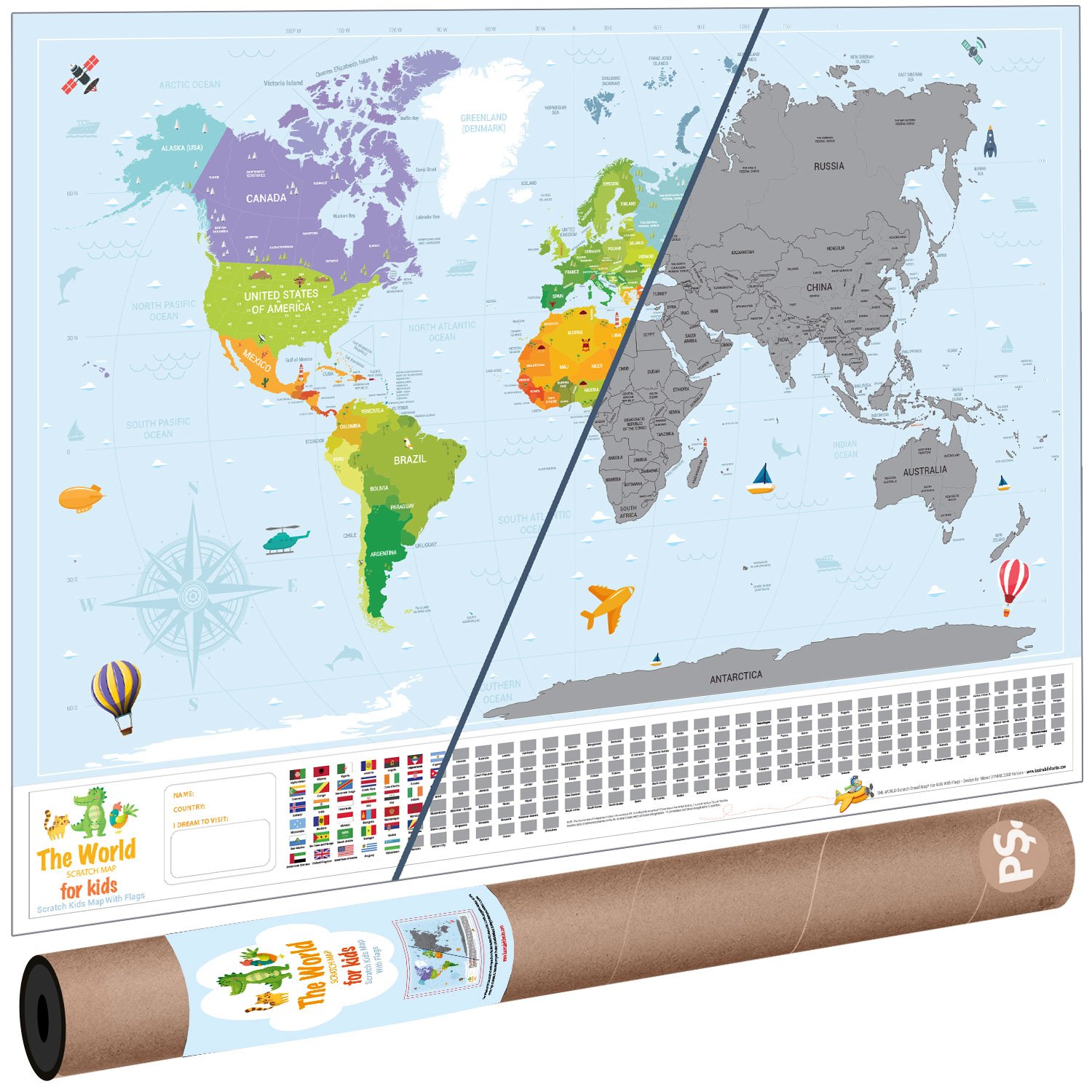 Eyaletli Bayraklı ÇOCUK HARİTASI Kazınabilir Poster Dünya Haritası Scratch Map.